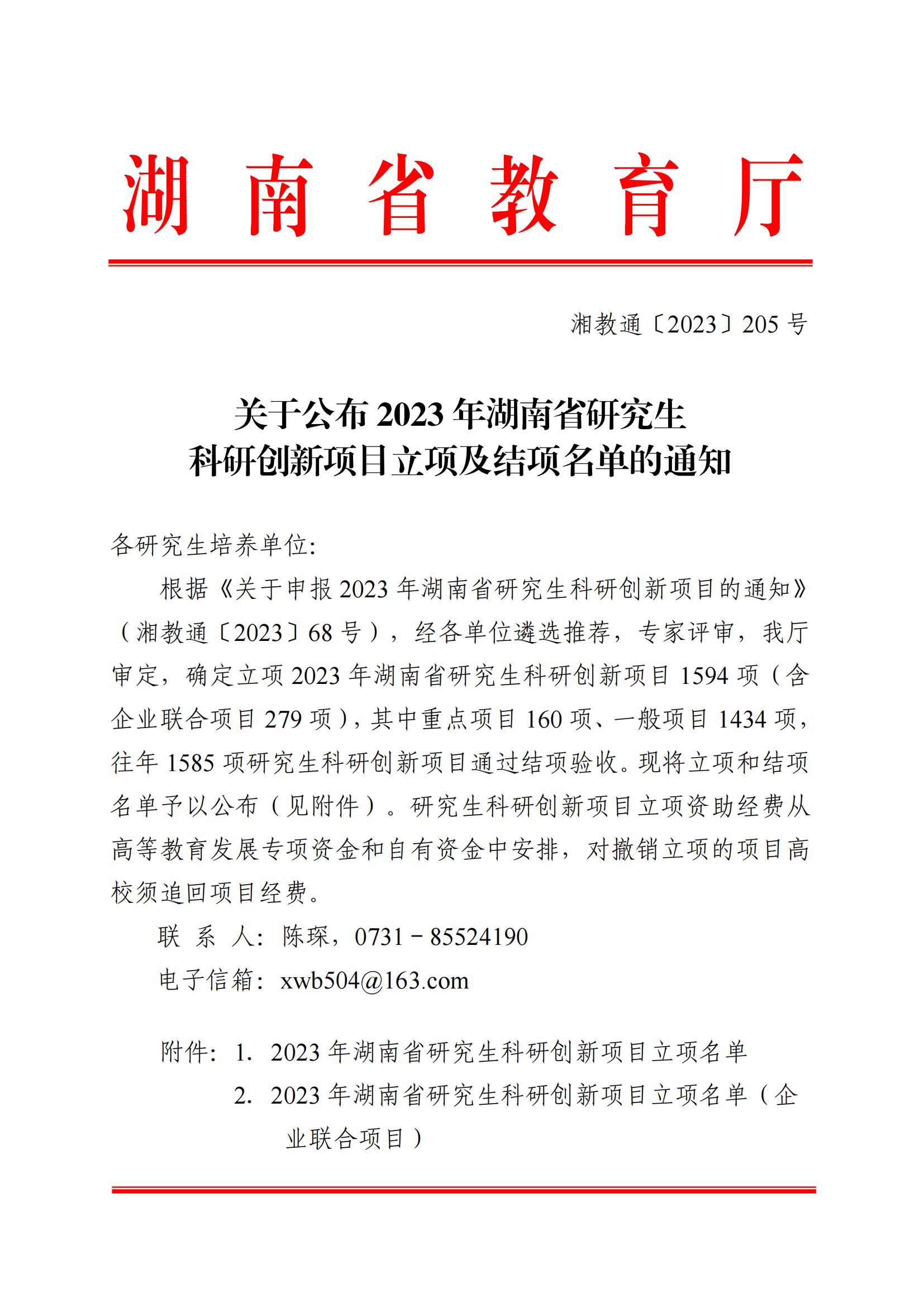 关于公布2023年湖南省研究生科研创新项目立项及结项名单的通知