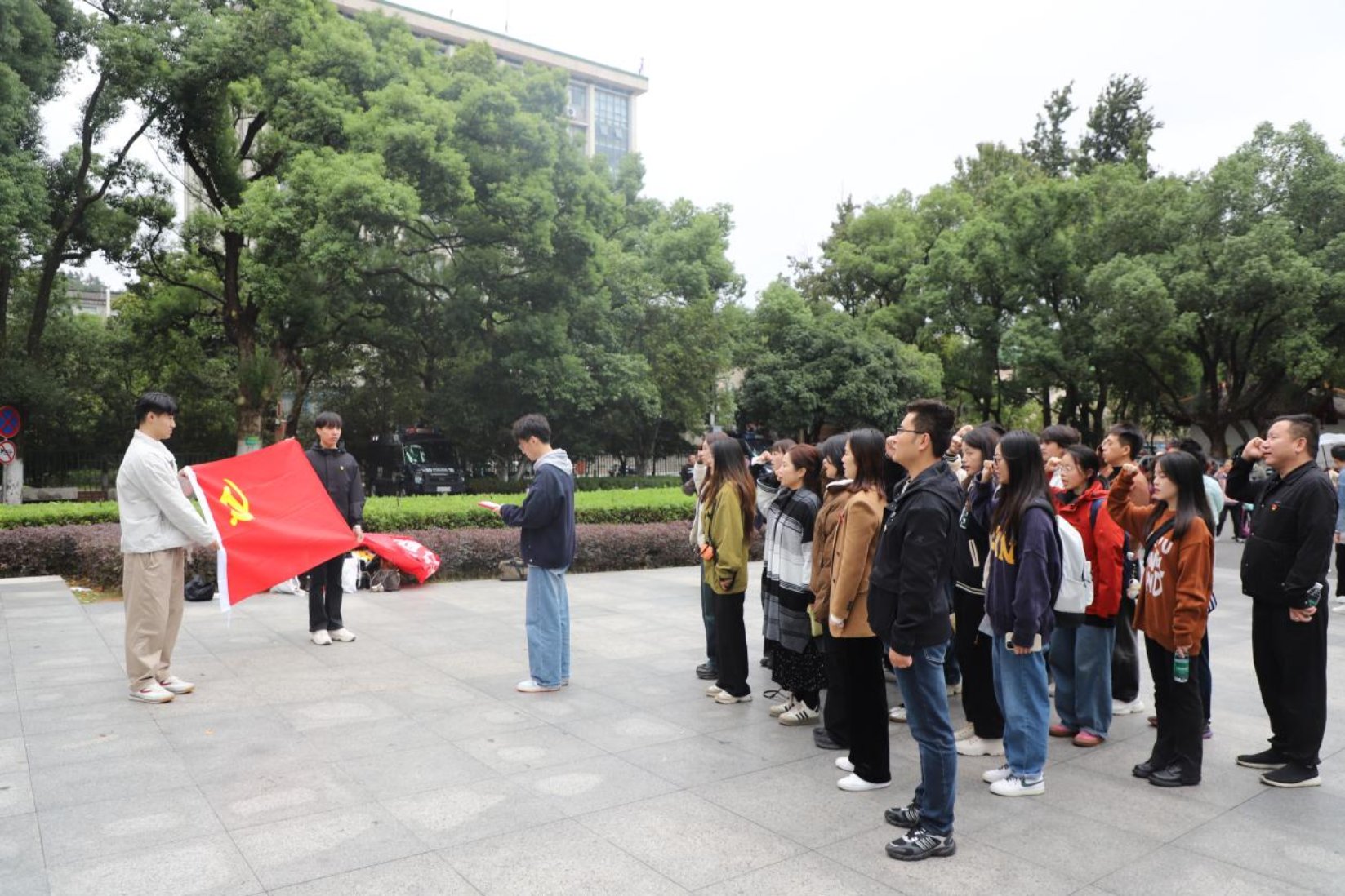 在东方红广场上,全体师生瞻仰一代伟人毛泽东的雕像,感悟伟人魅力。马克思主义学院2024级研究生邓选超带领全体党员重温入党誓词,铿锵有力的誓言在广场上回荡,燃起了在场师生的心中豪情,激励着他们从党的百年奋斗史中坚定初心使命。