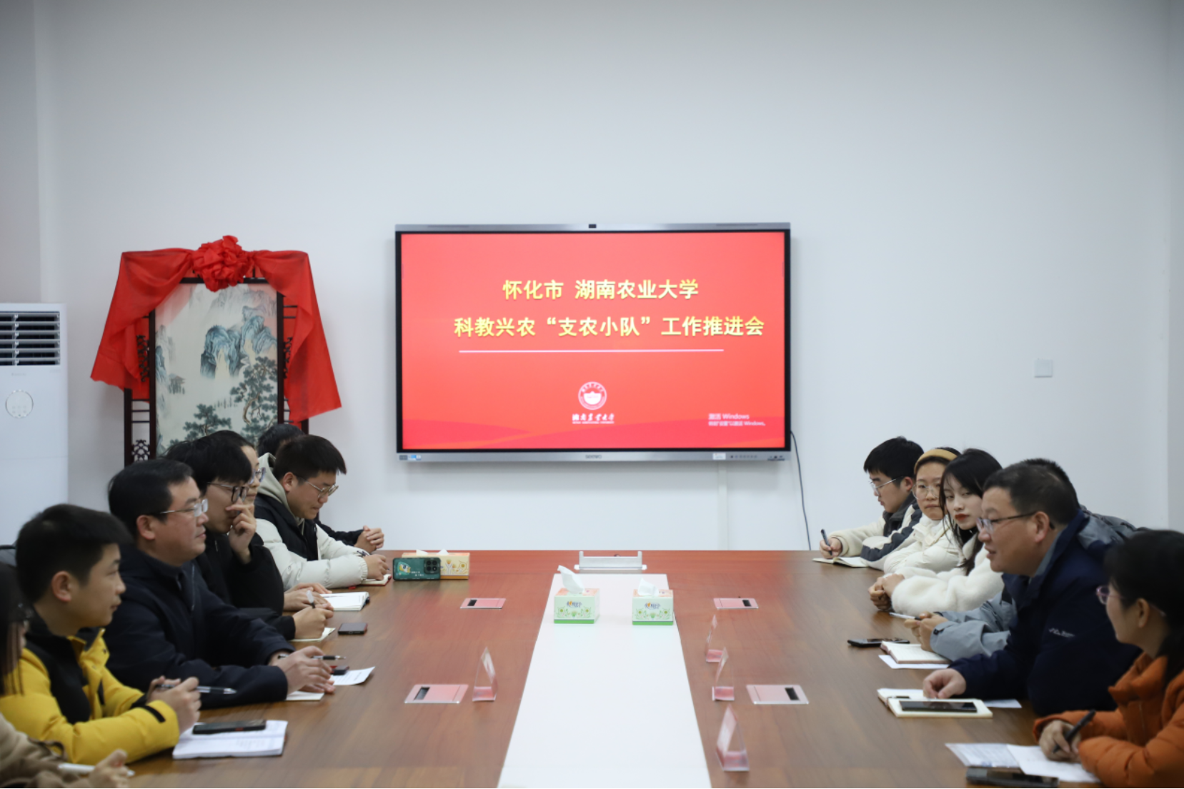 本网讯(研究生工作部 范颖平 刘家语)12月24日,怀化市、yl88858永利集团科教兴农“支农小队”工作推进会在5教201会议室召开,共同推进校地共建合作事宜。怀化市委农办副主任向雄、农业综合服务中心农业科技服务站站长杨原、农业农村局科教科副科长杨晓艳,研究生工作部副部长龙小军,研究生辅导员代表、支农小队成员代表参加会议。