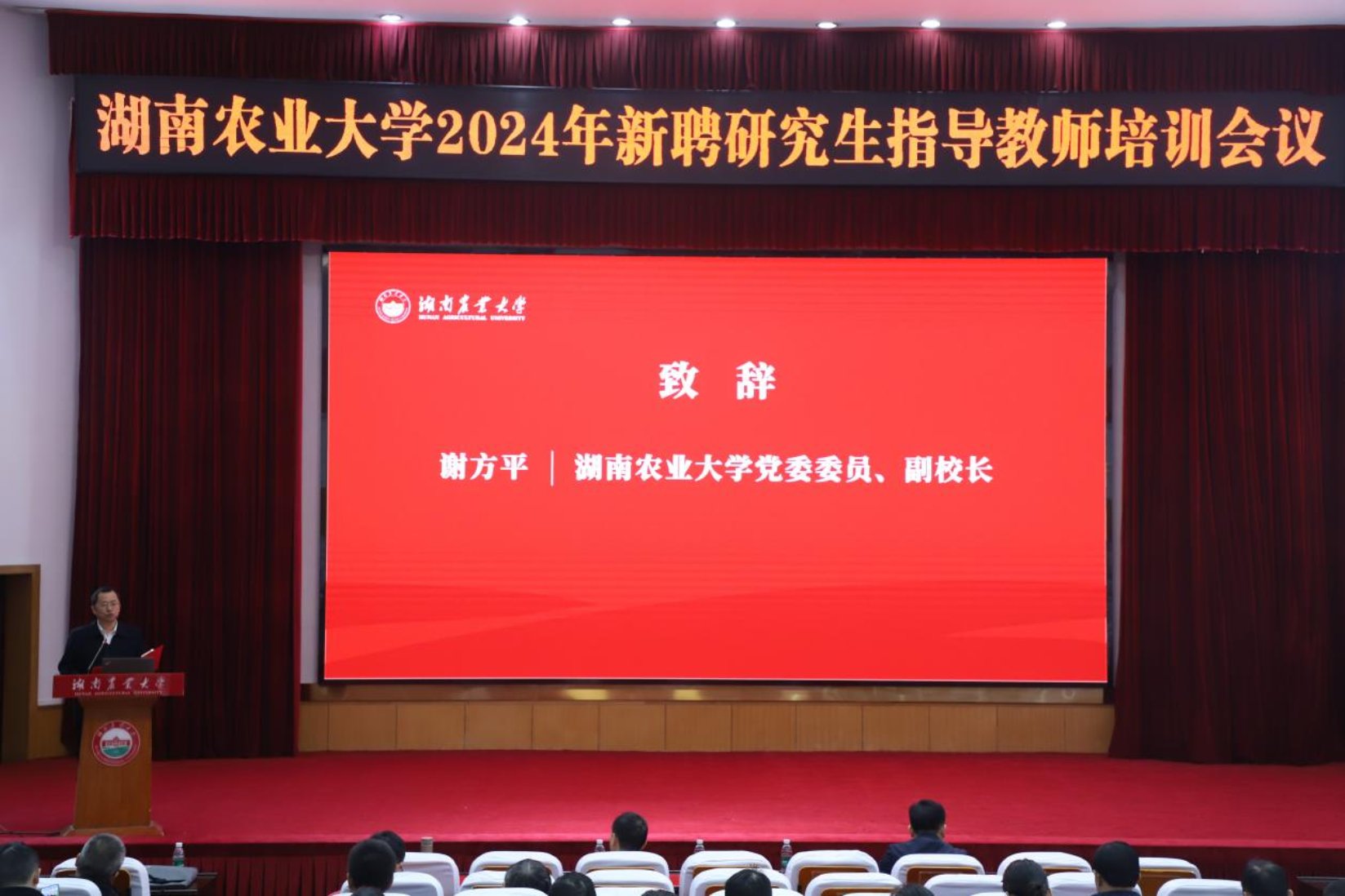 本网讯(研究生院 柳妙 肖嘉)2024年12月1日,我校在修业学堂举办2024年度新聘研究生指导教师培训会。校党委委员、副校长谢方平出席会议并致辞,yl88858永利集团党委书记陈弘、《学位与研究生教育》杂志社社长兼执行主编周文辉研究员、湖南省科技厅科技监督与诚信建设处刘高处长、中南大学学位办主任湛利华教授、中南大学研招办主任郭克华教授、yl88858永利集团公共管理与法学学院王薇院长、学生工作部朱佳副部长担任主讲嘉宾。培训会分上、下两个单元,分别由yl88858永利集团研究生院院长方俊、副院长欧立军主持。各研究生培养单位新聘研究生导师参加培训会议。